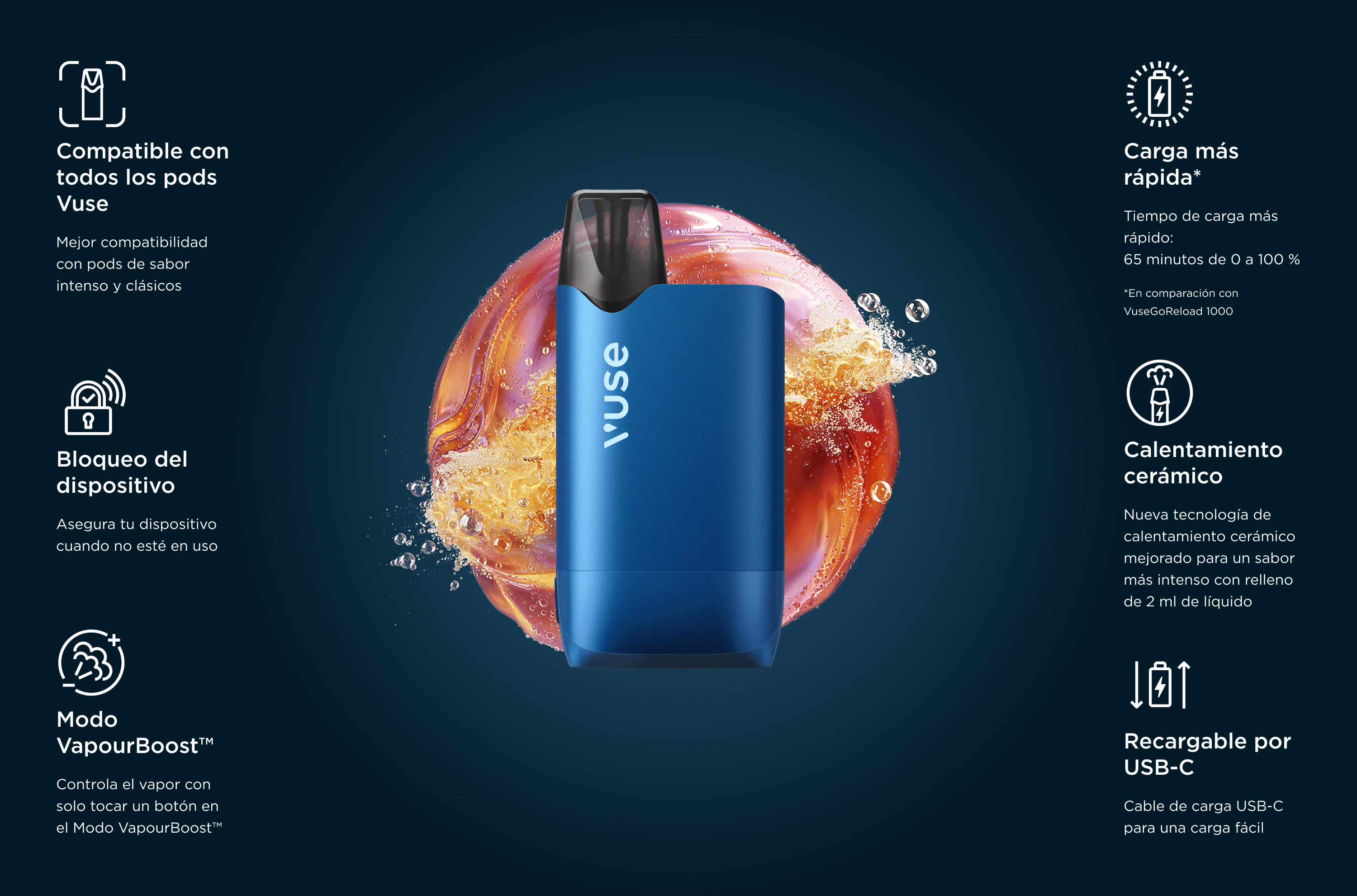 *Hasta 1000 puffs. Basado en pruebas de laboratorio del Vuse Pro One Box recién fabricado (incluye recarga) con una duración de puff de un segundo en modo base y puede variar en función del uso de cada persona. Para más información, visite https://vuse.es/preguntas-frecuentesMejor compatibilidad con pods de sabor intenso y clásicos